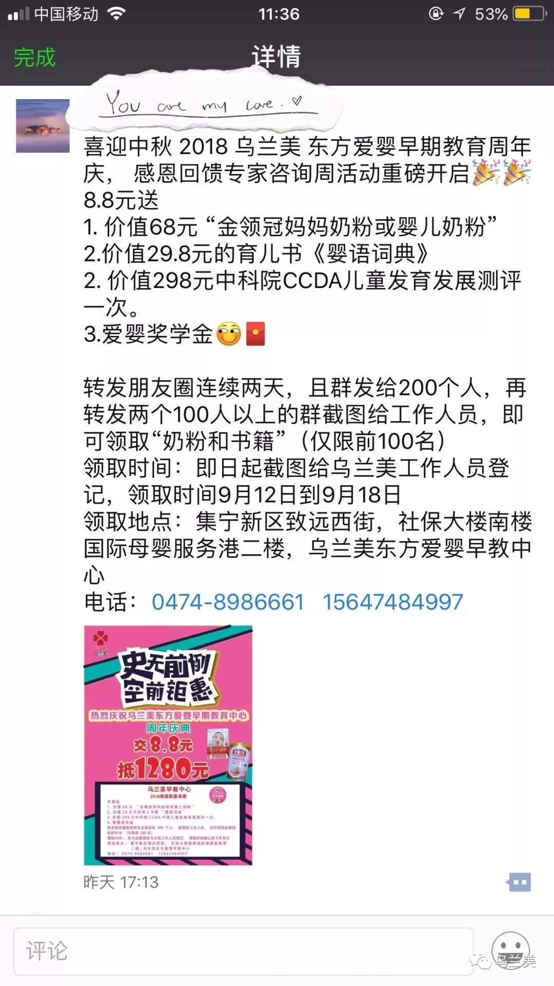 領(lǐng)取時間:即日起截圖給烏蘭美•東方愛嬰早教中心工作人員登記,領(lǐng)取時間截止到2018年9月19日。